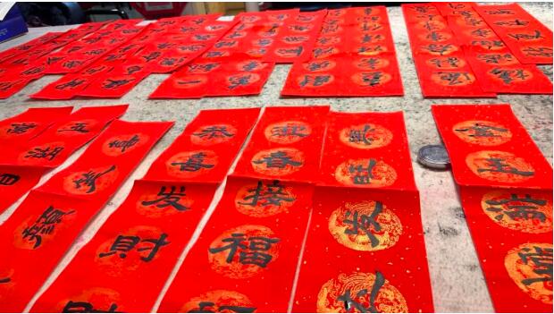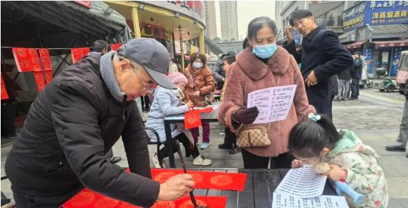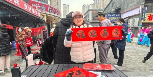 活动现场,红纸铺展,墨香四溢。书画家们凝神运笔,隶、楷、行、草各展风采,一笔一画尽显深厚艺术功底。 “春归大地人间暖,福降神州喜事多”“和顺一门有百福,平安二字值千金” 一句句吉祥喜庆的春联词句,在艺术家的笔下跃然纸上,红彤彤的春联与福字铺满桌面,为立春时节增添了满满的喜庆氛围。社区居民们围在桌前,挑选心仪的春联内容,有序领取墨香未干的作品,脸上洋溢着幸福的笑容。大家拿着寓意新年安康的春联,纷纷点赞此次文化惠民活动,直言“手写的春联更有年味,感谢书画院的艺术家们送来立春第一份祝福!”