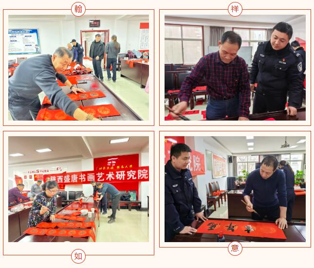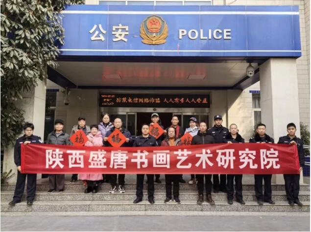 2月3日,农历腊月十六,年味渐浓之际,陕西盛唐书画艺术研究院携手多位知名书法家,走进三桥派出所开展“迎新春写春联”文化惠民活动。作为春风行动计划系列活动的重要一站,笔墨书香与警营温情交融,为坚守一线的民辅警们送上最真挚的新春祝福,本次活动由研究院常务院长周占宏总统筹,执行院长徐风琴组织、院长赵仲谋带队、副秘书长汪顺峰、副院长李建昱、赵瑞婷、孙世权、王俊强、王庭军、孙武正,安娜等书画老师参加。