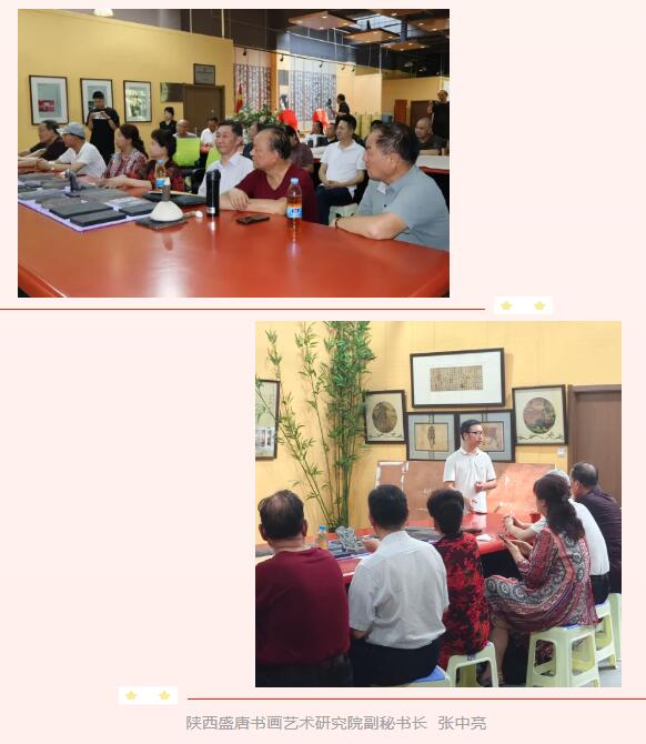出席此次活动的嘉宾有:陕西省文史馆馆员、陕西省书协行业专业委员会副主任白浪涛,陕西省直机关书画院秘书长曹成,陕西省国医研究院党委副书记常前林、西安石油大学副教授周武,陕西省非物质文化遗产项目“传统手工书画装裱修复技艺”代表性传承人、陕西元典文化研究院院长余江苇,陕西盛唐书画艺术研究院荣誉顾问王玲、院长赵仲谋、执行院长徐凤琴、常务院长周占宏、周峰川,常务副院长李双奇、杨成有、王战毅、办公室主任司雨晴等。