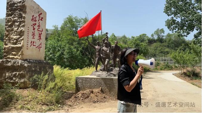 此次活动总策划、国家特级心理绘画心理学导师,陕西盛唐书画艺术研究院执行秘书长,少儿艺委会执行主任风灵(张志风)在红军雕塑前给孩子们做徒步爬山前松筋示范心理辅导。